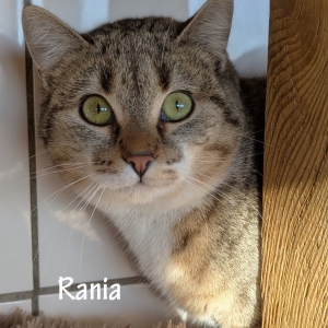 RANIA Femelle Naissance : 05/03/2025 Refuge depuis : 19/11/2025 Vaccinée, vermifugée, identifiée, stérilisée, testée Felv- et Fiv- OK : chats, enfants Visible à la Spa les Amandiers Lavilledieu Ardèche 04 75 94 27 05 Merci de téléphoner au refuge pour convenir d'un rdv afin de le rencontrer (les visites se font uniquement les après-midi du lundi au samedi) Participation adoption : 180€ RANIA a été trouvée sur la commune de Lalevade, non réclamée, elle est à l'adoption. Rania est une jolie et jeune minette. Gentille, assez calme et discrète en chatterie. En observation, elle préfère rester en retrait étant encore un peu craintive. Rania aura besoin d'une famille douce, calme et qui lui donnera le temps de s'adapter et de prendre confiance.