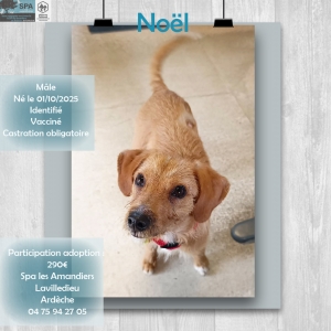 NOËL Mâle Croisé berger Taille (adulte) : moyenne Naissance : 01/10/2025 Refuge depuis : 24/12/2025 OK : chiens, chats, enfants, furets Vacciné, vermifugé, identifié CASTRATION OBLIGATOIRE dès qu'il aura l'âge. Participation adoption : 290€ Merci de téléphoner directement au refuge afin de convenir d'un rdv pour le rencontrer Il se trouve à la Spa les Amandiers Lavilledieu Ardèche 04 75 94 27 05 NOËL (trouvé la veille de Noël) a été trouvé sur la commune de St Didier sous Aubenas, non réclamé, est à l'adoption. Cet adorable petit loulou est arrivé dans un état déplorable. Atteint d'une polyarthrite infectieuse, il a été sous traitement à partir du 28/12/2025. Après 2 mois de traitement, tout est rentré dans l'ordre, il a juste temporairement un soutien médicamenteux articulaire (Glycosane) 1 fois/jour (fourni par le refuge). Noël est un chiot très joyeux. Il est plein de vie, plein d'énergie, adorant courir, et jouer avec des copains, un extérieur sera un plus pour son épanouissement ainsi qu'un autre chien dans le foyer. Noël est propre, il sait rester seul sans faire de bêtises, il lui faut juste des jouets afin de l'occuper. Ce petit chou espère trouver rapidement la famille qui saura l'aimer, le respecter et lui apporter toute l'attention qu'il mérite