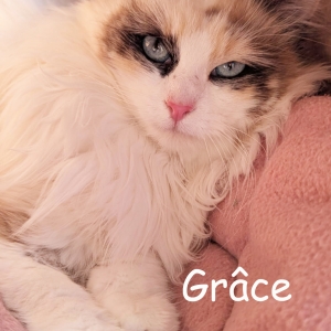 GRÂCE Femelle Naissance : 05/03/2024 Refuge depuis : 15/02/2026 Vaccinée, vermifugée, identifiée, stérilisée, testée Felv- et Fiv- OK : chats, enfants Visible à la Spa les Amandiers Lavilledieu Ardèche 04 75 94 27 05 Merci de téléphoner au refuge pour convenir d'un rdv afin de la rencontrer (les visites se font uniquement les après-midi du lundi au samedi) Participation adoption : 200€ GRÂCE a été trouvée sur la commune de Orgnac l'Aven, non réclamée, elle est à l'adoption. Belle minette aux poils mi-longs, Grâce est cependant un peu craintive par toutes ces nouveautés pour elle. Elle aura besoin d'un peu de temps pour se détendre et pour apprendre à faire confiance. Grâce recherche une famille responsable, douce et patiente.